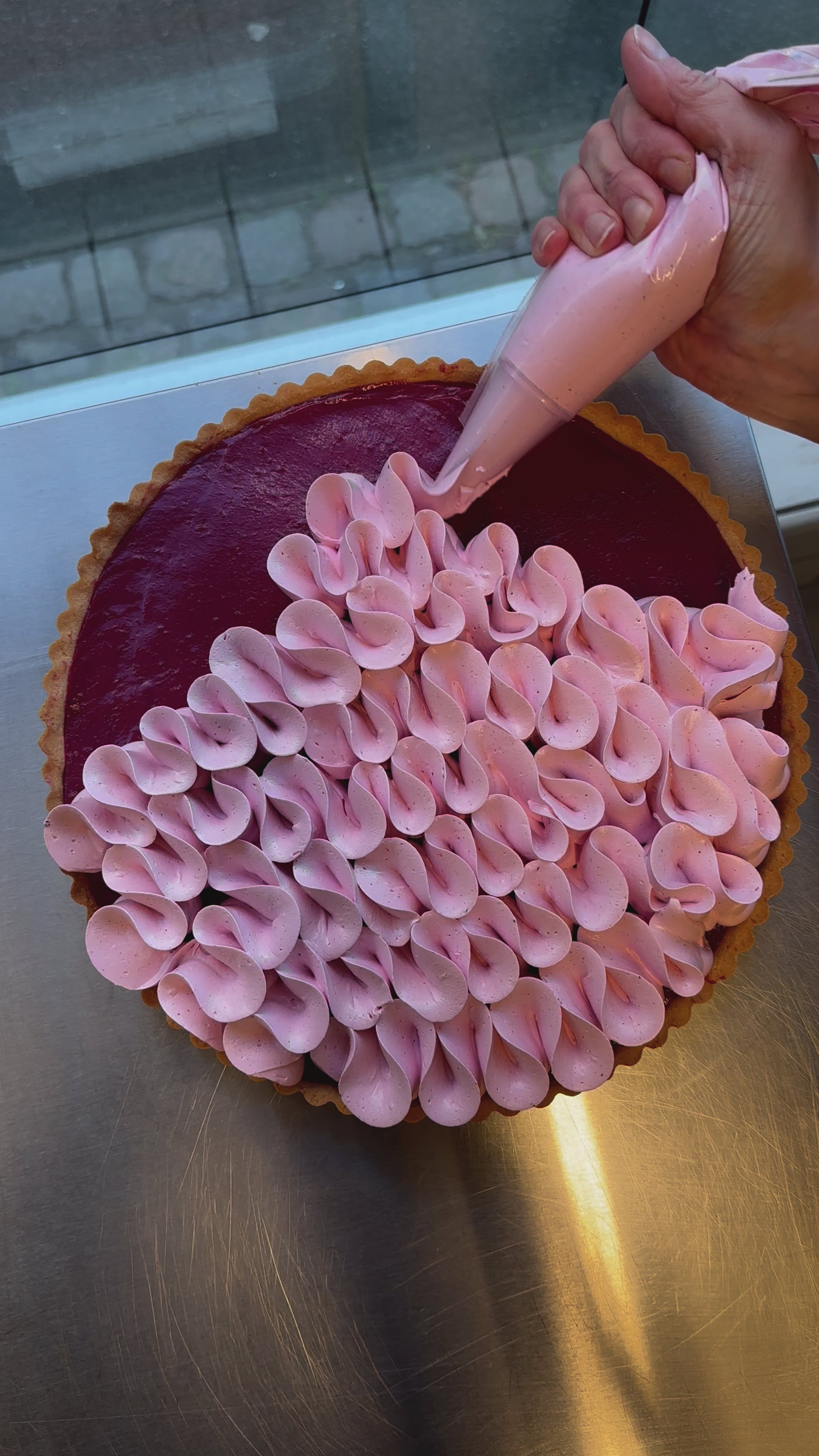 Sprød tærteskal med solbær curd, saltet karamel og røde bær marengs.